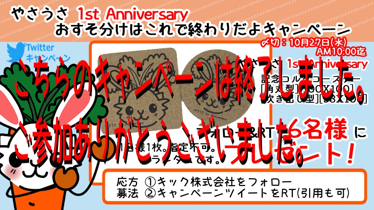 やさうさ1st Anniversaryおすそ分けはこれで終わりだよキャンペーンは終了いたしました。